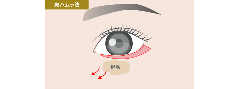 裏ハムラ法は、経結膜脱脂術の「傷跡が残らない」というメリットと、ハムラ法の「くぼみも改善できる」というメリットの両方を備えた施術法です。