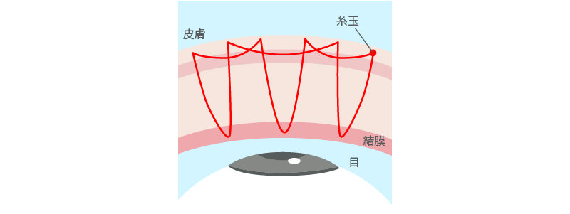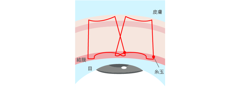 結び目の糸玉が皮膚の表面側にある通常の埋没法とは異なり、2つのループで二重を形成し、瞼の裏側に結び目が来る術式が裏留め二重埋没法です。従来の瞼板法では糸玉がまぶたから透けたり、目を閉じた際に糸玉が目立つケースがありますが、裏留め二重埋没法はまぶたの表面に傷跡が出来ず、施術後の糸玉も目立ちません。